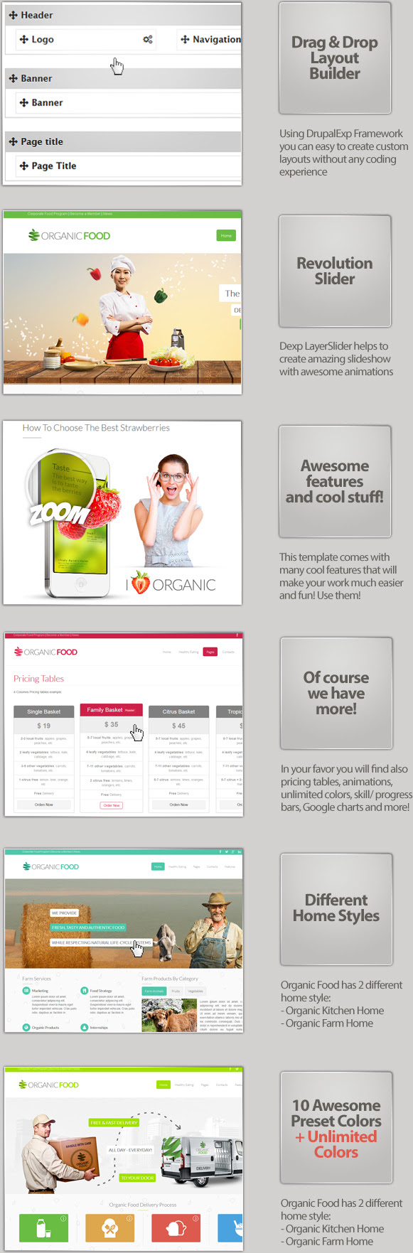 Organic Food is a clean and modern Drupal 7 theme. It’s based on DrupalExp Framework which gives the theme big variety of features such as Unlimited color options, Unlimited regions and Drag & Drop Layout Builder. Organic Food also comes with Dexp LayerSlider, pricing tables and many more! Organic Food can be used as well for a Food, Farm, Restaurant sites and also for any type of business or corporate site.